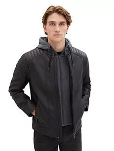 TOM TAILOR Męska kurtka skórzana w stylu motocyklowym z odpinanym kapturem i kurtką wewnętrzną z dżerseju, 29999-czarny, L