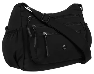 Czarna torebka damska z tkaniny PETERSON mała listonoszka na ramię szeroki pasek kieszonki na suwak kieszonki otwarte