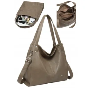 Torebka damska LUIGISANTO V862 TaupeStylowy i funkcjonalny wybórTorebka damska LUIGISANTO V862 to doskonałe połączenie elegancji i praktyczności, idealna dla nowoczesnej kobiety. Wykonana z wysokogatunkowej skóry ekologicznej, jest nie tylko przyjazna dla środowiska, ale także wyjątkowo trwała i łatwa w pielęgnacji. Jej uniwersalny design sprawia, że pasuje do wielu stylizacji - od casualowych po bardziej formalne.Przemyślana konstrukcjaTorebka wyposażona jest w główną komorę zamykaną na solidny suwak, co gwarantuje bezpieczeństwo Twoich rzeczy. Wewnątrz znajdziesz przegrodę na suwak, która skutecznie oddziela różne przedmioty, ułatwiając organizację. Z jednej strony umieszczono dodatkową kieszonkę na suwak, idealną na cenne drobiazgi, a z drugiej dwie wsuwane kieszonki, które pomieszczą telefon lub inne małe akcesoria. Z tyłu torebki znajduje się dyskretna kieszonka na suwak, idealna na szybki dostęp do najczęściej używanych rzeczy.Detale, które robią różnicęUsztywniane dno zapewnia torebce stabilność i sprawia, że zachowuje swój kształt niezależnie od zawartości. Srebrne okucia dodają jej subtelnego, nowoczesnego blasku, podkreślając elegancki charakter. Dzięki przemyślanemu rozmiarowi, torebka z łatwością pomieści format A4, co czyni ją idealnym wyborem zarówno do pracy, jak i na uczelnię.Twoja codzienna towarzyszkaLUIGISANTO to torebka, która z łatwością sprosta wyzwaniom codzienności, jednocześnie dodając szyku każdej stylizacji.Specyfikacja torebki: