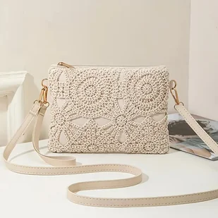 TEMU Ręcznie Robiona Torba Boho Crossbody z Haftem i Chwostem Posiada Regulowany Pasek, Zapięcie na Zamek Błyskawiczny, Złote Akcenty i Beżową