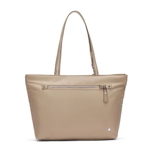 Torba damska antykradzieżowa Pacsafe W - beżowa Ta pojemna torba oferuje wyrafinowany, minimalistyczny styl, idealny w podróży, do pracy lub w każdej sytuacji wymagającej dużej ilości miejsca. Wyposażona jest w wyściełaną przegrodę na laptopa do bezpiecznego przechowywania sprzętu elektronicznego, przegrodę bagażową ułatwiającą transport, przednią komorę z szybkim dostępem, pojemną kieszeń zapinaną na zamek z blokadą RFID oraz liczne przegródki na telefon, długopisy, przenośną ładowarkę i wiele innych rzeczy. Dyskretne zabezpieczenia antykradzieżowe zapewniają Ci spokój ducha. Torby damskie z serii Pacsafe W to szyk i elegancja Wewnętrzne kieszenie do uporządkowania sprzętu Kieszeń na tablet lub laptop o przekątnej 13" Wnętrze torby jest jasne co bardzo ułatwia odszukanie w nim konkretnego przedmiotu Ekspres komory głównej został zabezpieczony przed niepożądanym rozsunięciem Zamykana na ekspres główna komora z organizerem na telefon i inne akcesoria Zabezpieczona technologią eXomesh, która chroni przed kradzieżą poprzez rozcięcie torby Specjalna kieszeń chroni karty oraz dokumenty wykorzystujące technologię RFID przed zeskanowaniem i kradzieżą tożsamości Szlufka na długopis ułatwiająca przechowywanie ? TurnNLock Security Hook – Obrotowy karabińczyk z blokadą Inteligentny zaczep, który pozwala szybko zabezpieczyć torbę wokół nogi stołu. Ty jesz spokojnie obiad, a Twój bagaż nigdzie się nie wybiera.