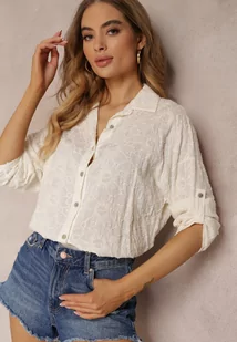 Beżowa Haftowana Koszula z Wiskozy z Podwijanymi Rękawami Nobonsei