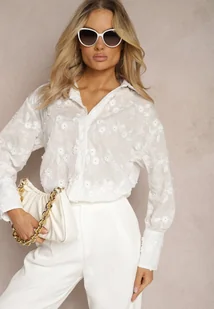 Biała Koszula Ozdobiona Haftami i Kwiatkami z Wysokim Mankietem Lirexia