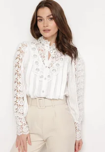 Biała Elegancka Koszula ze Stójką Ozdobiona Koronką i Perełkami Tebenia