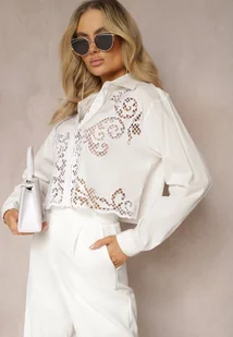 Biała Bawełniana Koszula o Krótkim Fasonie z Ażurowym Wykończeniem Leama