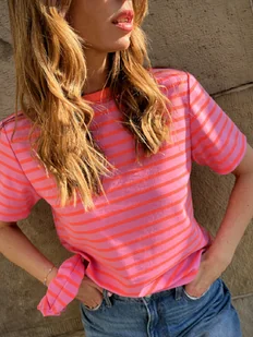 T-shirt z bawełny. Wyróżniają go; fantazyjne, żywe połączenie soczystego różu i fluo pomarańczu, najwyższa jakość polskiej produkcji bawełny, mięsisty i gruby splot - 240g/m2, a także absolutnie komfortowa, pud ...