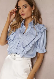 Niebieska Koszula z Koronkowym Kołnierzem i Falbankami Neria