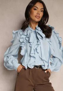 Niebieska Koszula Zdobiona Falbanami i Wiązaniem przy Szyi Ravissa