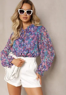 Niebiesko-Fioletowa Siateczkowa Koszula w Kwiatowy Wzór z Wiązaniem Przy Dekolcie Ilerena