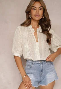 Beżowa Koszula z Bawełną i Stójką Wykończona Guzikami Vosofia