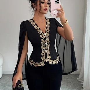 TEMU Damska czarna bluzka z długim rękawem DJ0712006 charakteryzuje się kontrastowymi, złotymi koronkowymi zdobieniami i unikalnym designem.