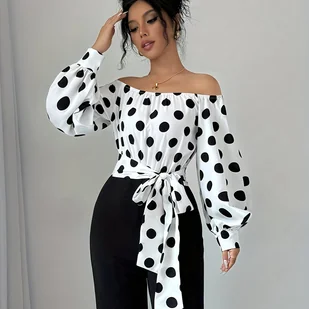 TEMU Bluzka Damska Elegancka z Odkrytymi Ramionami w Kropki, Kokardką i Bufiastymi Rękawami - Biało-Czarna, Okrągły Dekolt, Kołnierzyk Strukturalny,