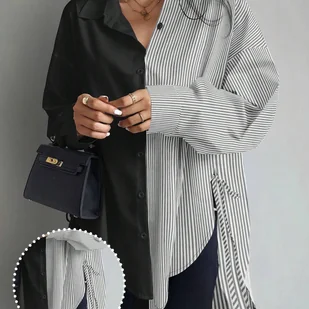 TEMU Damska koszulka w paski w blokach kolorystycznych z asymetrycznym dołem, bluzka z długim rękawem dla kobiet