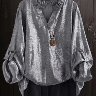 TEMU Elegancka bluzka damska w złotym odcieniu - koszula z długim rękawem i dekoltem w serek, zapinana na złote guziki, o strukturalnym kroju i