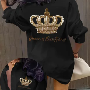 TEMU Elegancka bluzka damska z długim rękawem i nadrukiem Korony i Królowej Wszystkiego - ze złotymi napisami, tłem, okrągłym dekoltem, idealna na co