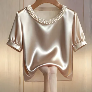 TEMU Elegancka Bluzka Damska z Okrągłym Dekoltem i Perłowymi Ozdobami, Idealna do Codziennego Noszenia, Satynowa Bluzka z Perłami, Złote Bluzki
