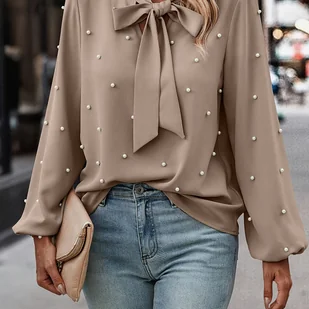 TEMU Elegancka Bluzka Damska z Perłowymi Ozdobami, Bufkowe Rękawy i Stójkowym Kołnierzem - Beżowa Koszula w Długim Kroju Przypominająca Kurtkę,
