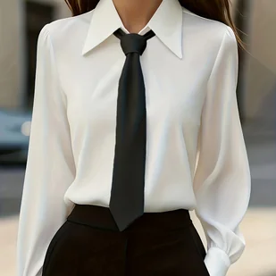 TEMU Elegancka damska koszula z długim rękawem w kontrastowym czarno-białym kolorze z klapami Jednolity , idealna na wiosnę/jesień