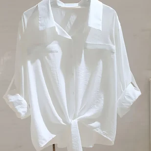 TEMU Elegancka Koszula Damska w Stylu Francuskim z Kołnierzykiem i Krawatem – Długi Rękaw, Biała, na Każdą Porę Roku, do Stylu Casual i Biznesowego –