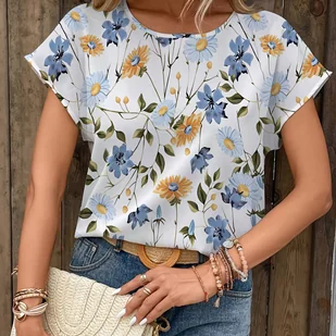 TEMU Modny i swobodny damski T-shirt z krótkim rękawem, okrągłym dekoltem i niebiesko-żółtym kwiatowym nadrukiem w stylu "".