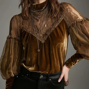 TEMU Retro Złota Aksamitna Koszula z Koronkowymi Rękawami Lampionowymi, Modna, Temperamentowa, Wygodna i Luźna Koszula, Idealna do Dojazdów do Pracy,