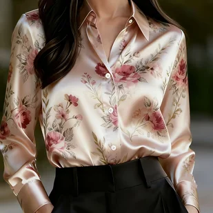 TEMU [Styl] Elegancka Koszula Satynowa Damska Specjalnej Edycji z Nadrukiem - Koszula z Długim Rękawem, Kołnierzyk, Średnia Elastyczność i Możliwość