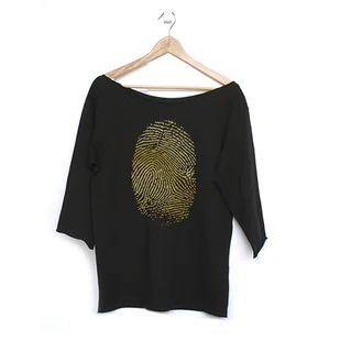 Czarna koszulka ze złotym odciskiem palca. Na życzenie możemy zmienić kolor nadruku i/lub koszulki. Możemy także ten nadruk wykonać na innym naszym produkcie. Prosimy o kontakt. Nadruk ze specjalnej folii, ...