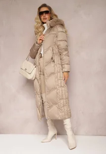 Beżowa Pikowana Kurtka Maxi Płaszcz z Ozdobnym Marszczeniem i Futerkiem Estenous