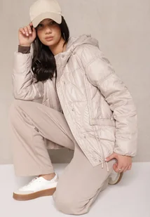Beżowa Kurtka z Kapturem Ozdobiona Przeszyciami i Sznurkami Boledia