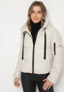 Biała Pikowana Kurtka Puffer z Kapturem i Ozdobnymi Taśmami Relania