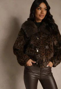 Brązowa Panterkowa Kurtka Futerko o Krótkim Kroju z Ozdobnymi Zapięciami Otiluna