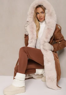 Brązowa Kurtka Parka z Kapturem Futrzaną Wyściółką i Ściągaczem w Talii Semarien