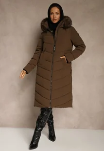 Brązowa Długa Kurtka z Pikowanymi Przeszyciami i Kapturem z Futerkiem Galella