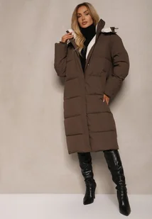 Brązowa Długa Kurtka Pikowana z Odpinanym Kapturem i Kieszeniami Etarose
