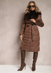 Brązowa Pikowana Kurtka Płaszcz za Kolano z Wiązanym Paskiem i Futerkiem Vivenda