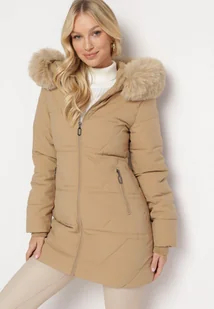 Ciemnobeżowa Kurtka w Geometryczne Pikowanie z Kapturem i Futerkiem Bellinae
