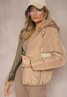 Ciemnobeżowa Pikowana Kurtka Dwustronna z Kapturem Ozdobiona Suwakami Nevetila