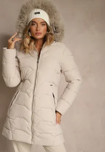 Ciemnobeżowa Taliowana Kurtka z Pikowanymi Przeszyciami i Kapturem z Futrem Mundria