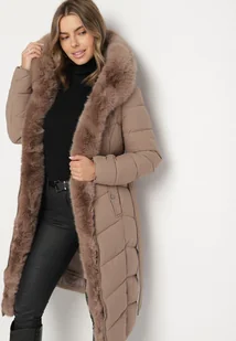 Ciemnobeżowa Pikowana Kurtka z Futerkowym Obszyciem i Paskiem Samiria