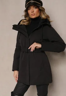 Czarna Długa Kurtka Pikowana z Bawełną i Kapturem Ozdobiona Paskiem z Klamrą Seniraen