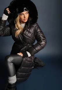 Czarna Długa Kurtka Pikowana z Odpinanym Kapturem Ozdobionym Futerkiem i Paskiem Iveleti