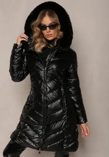 Czarna Pikowana Kurtka Metaliczna z Kapturem i Futerkiem Vivana