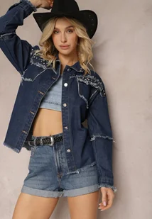 Granatowa Jeansowa Kurtka z Bawełny z Rozprutymi Elementami i Ćwiekami Trudilla