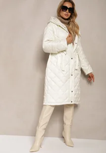 Jasnobeżowa Pikowana Kurtka o Długim Kroju z Kapturem Paskiem i Ściągaczami w Talii Nikiana