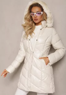 Jasnobeżowa Pikowana Kurtka z Odpinanym Kapturem i Ozdobnym Futerkiem Ainoa
