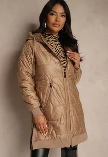 Jasnobrązowa Przejściowa Kurtka z Kapturem Zdobiona Pikowaniem Fesulia