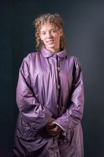Krótki płaszczyk nabłyszczany ocieplany jasny fiolet Oversize Guziki kokosowe, zapinany na pętelki Ocieplina pol ...