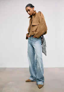 Kurtka wykonana z tkaniny imitującej sztuczny zamsz. Krój balonowy z kołnierzykiem z klapami. Długi rękaw i dół zakończony elastyczną gumką. Z przodu naszyte kieszenie. Zapięcie z przodu na suwak.