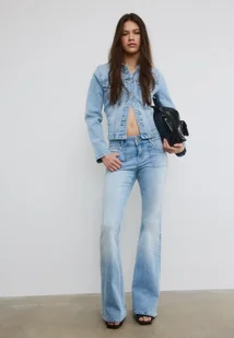 Dopasowana kurtka jeansowa z kołnierzem z klapami i długimi rękawami. Z przodu naszyte kieszenie. Zapięcie na metalowe guziki z przodu.