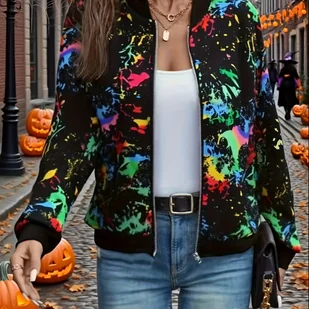 TEMU Kreatywny geometryczny wzór, elegancka i modna bluzka z długim rękawem dla kobiet na wiosnę i jesień, kurtka z kołnierzykiem typu baseball w